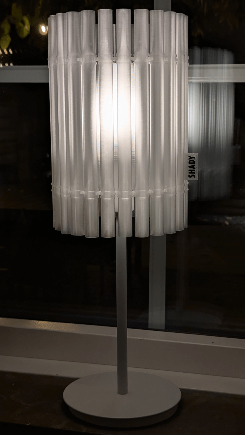 Playfull lampshade designed for additive manufacturing using 3D-printing. Easy toolless assembly of the 28 total parts. The translucent PET-G plastic allows light to pass through while it accentuating the texture of the manufacturing method. A translucent diffuser is used to even out the light spread and make the light more gentle for the users eyes.